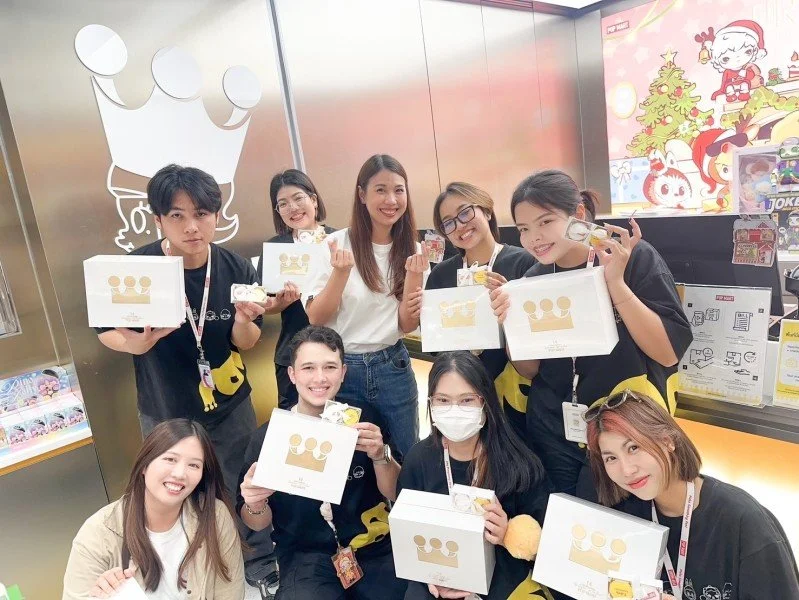 Pop Mart staff brandish crown-logo gift boxes after a successful drop. | Pop Mart Company LinkedIn