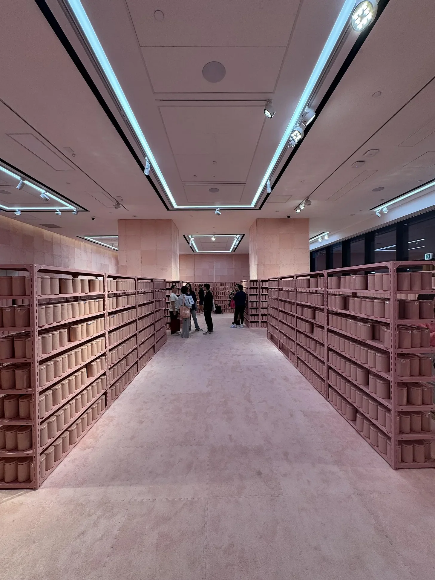 At the register, staff drop the cans into glossy pink paper bags. When you step back out into West Kowloon, you see those bags everywhere—on the escalators up to M+, outside Hong Kong Palace Museum, along the harbor steps. The pink installation leaks into the district.