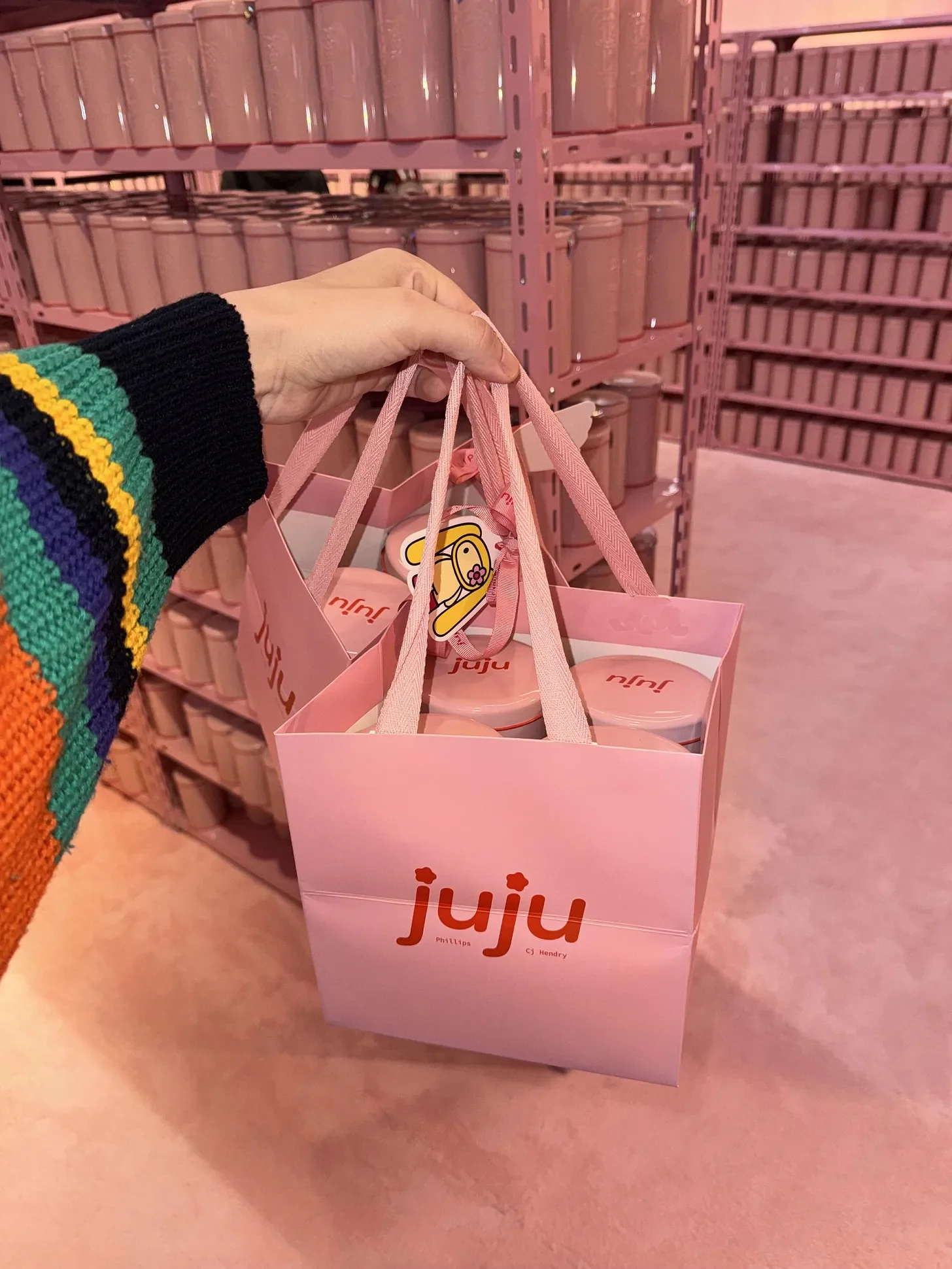 Pink Juju bags after checkout at Phillips Asia Headquarters. Each can inside hides a different blind-pack Juju bag charm.