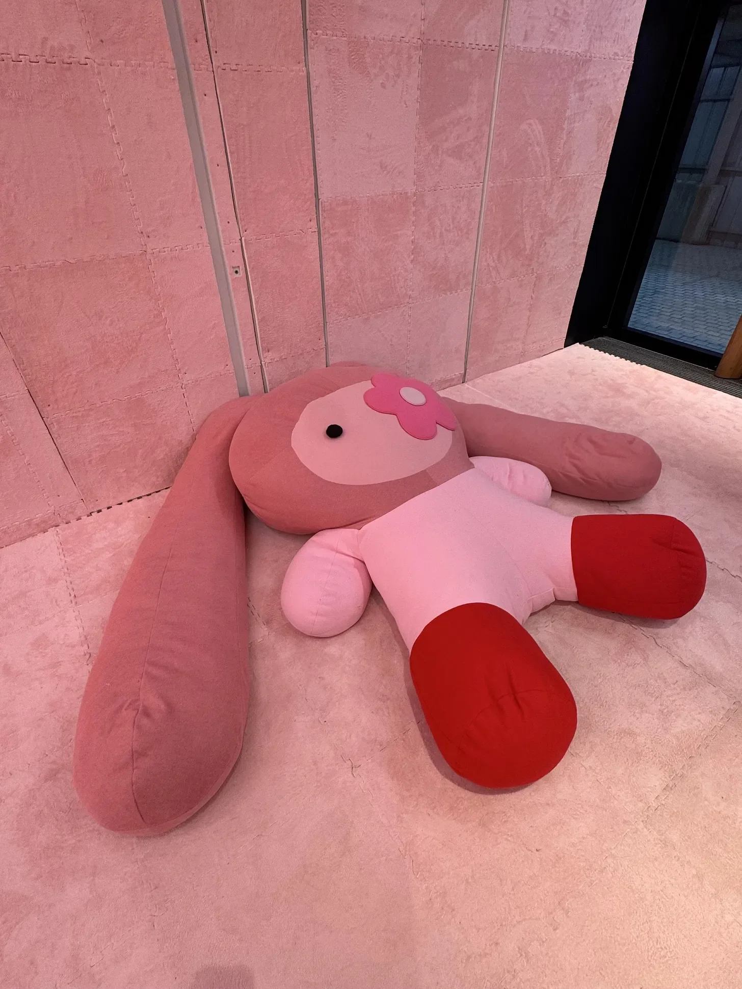 This is the pink supermarket space, the one with the cans, carts, and padded pink floor.