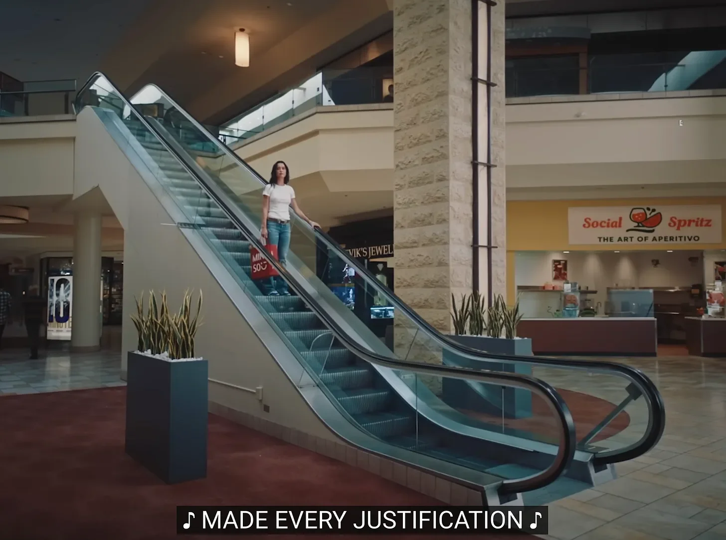 The scene cuts to her calmly sawing through a tree branch she’s sitting on, then tumbling as it falls, before we see her riding a mall escalator with a MINISO bag, shoelace untied, getting violently sucked into the machinery.