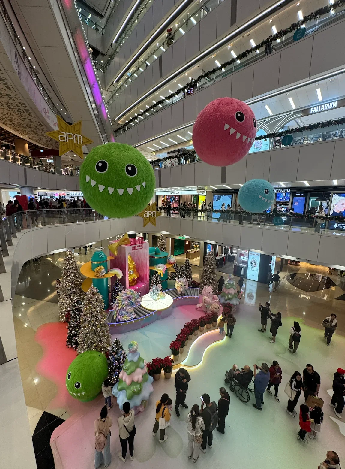 APM × INSTINCTOY’s “X’mas Toy Lab” turns the floor-level atrium of APM in Kwun Tong into a Christmas monster lab, running November 22, 2025–January 4, 2026. The Christmas installation spotlights giant sculptures of INSTINCTOY’s cult characters (Muckey, Monster Fluffy, and Mini Ice Vincent) posed around a stage.