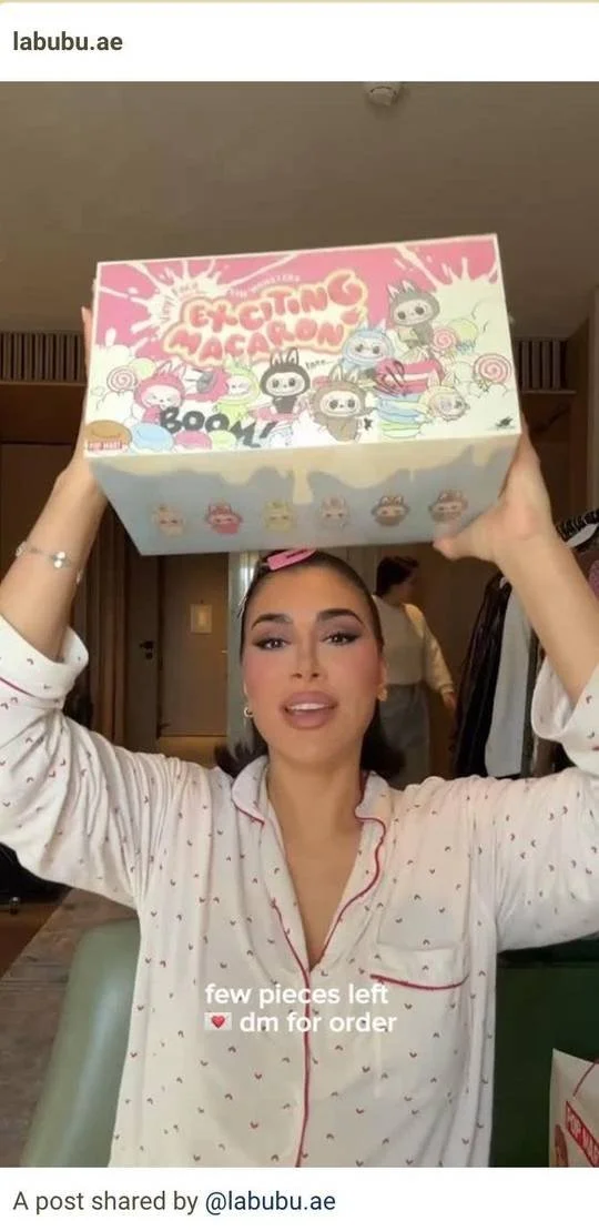 A repost of a Dubai collector on @labubu.ae lifts an “Exciting Macaron” Labubu gift box on Instagram, urging Gulf fans to DM before the last few sets vanish.